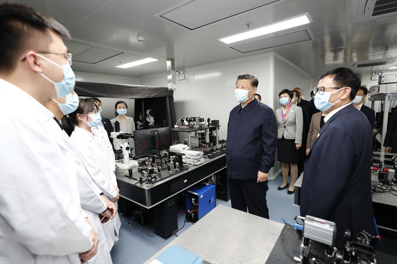 4月19日,在清华大学建校110周年校庆日即将来临之际,中共中央总书记、国家主席、中央军委主席习近平来到清华大学考察。这是习近平在清华大学成像与智能技术实验室同师生们亲切交谈。