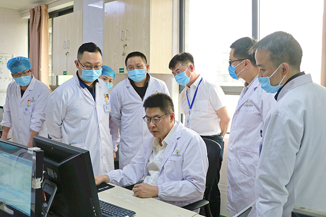 随后,广西医科大学附属肿瘤医院一行在蒋福明等陪同下深入医院肛肠科、肿瘤科、麻醉科、放射科、放疗科、病理科等科室,查房指导,并就学科建设、临床诊疗等方面进行深入交流。