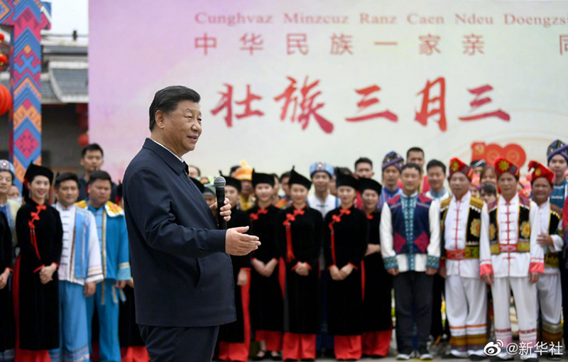 27日上午,正在广西南宁考察的习近平总书记来到广西民族博物馆,了解壮族历史、文化习俗等情况。博物馆外,正在举办三月三“歌圩节”民族文化活动,习近平不时驻足观看,向大家挥手致意,为大家鼓掌。习近平高兴地说,广西这些年发展进步很大,脱贫攻坚任务顺利完成了,630多万人脱贫。我说过,脱贫路上一个也不能少,一个民族都不能少。中国人说话、中国共产党说话、中国共产党的领导说话是算数的。现在全中国56个民族都脱贫了,兑现了我们的庄严承诺。我们还不能停步,接下来要向着第二个百年奋斗目标新征程迈进,一个民族也不能少,加油、努力,再长征!