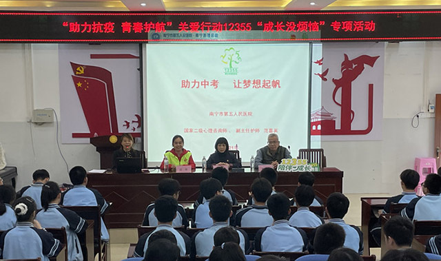 随着中考脚步的临近,为帮助九年级的学生排解心理困扰,激发学习潜能,营造良好的应考氛围,助力各位考生树立健康、坦然、自信的考前心态,4月28日下午,由共青团南宁市委、广西12355青少年服务、南宁市绿城青少年事务社会工作服务中心联合南宁市第五人民医院组成一支“青春护航队”深入到南宁市良庆区那马初级中学,为该校九年级学生开展“助力中考·让梦想起帆”中考减压专题心理健康讲座。