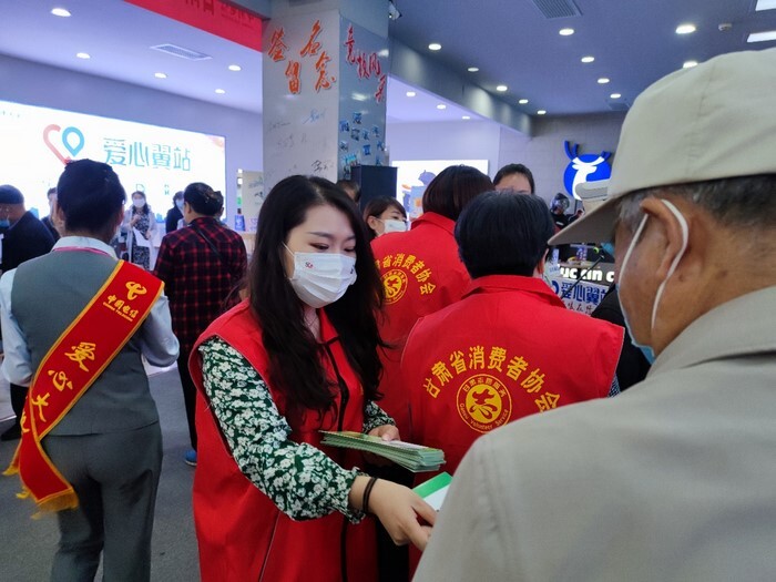 甘肃省消费者协会工作人员在现场为消费者提供了咨询服务,为参加活动的环卫工人、快递小哥等户外劳动者,老年消费者发放了甘肃省消费者权益保护条例解读、2021年消费维权年主题宣传手册、2021年消费宝典等消费教育公益读本。
