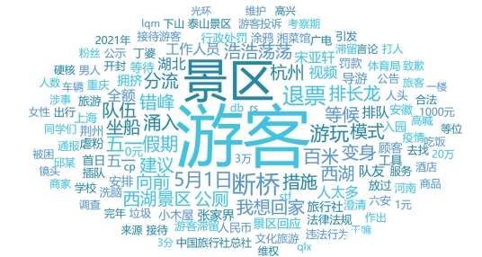 从本次监测的舆情反馈来看,因“五一”期间旅游市场恢复,全国多个景区人山人海,并出现排队现象,个别景区因人数太多导致游客大喊退票,相关舆情信息量显著增多。承德游乐场游乐设施发生故障游客被困,市场监管总局官网回应暂停使用威海金山游乐设备有限公司飞行塔类大型游乐设施。此外,还有一些游客不文明现象,如川美老校区经过精心设计并审核通过才能绘画上墙的涂鸦街被游客反复随意乱涂等关注度较高。
