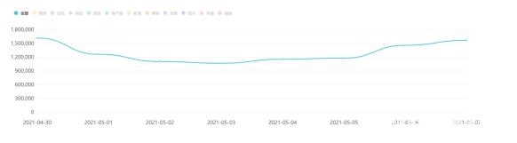 监测期间,“消费维权”信息呈曲线波动走势,假期首尾舆情信息量较大。其中假期伊始的4月30日最多,为1618105条,比5月7日假期结束的1602060条多出16045条 。